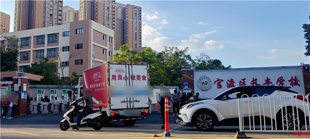 学校新更换的送餐企业的餐车来送晚餐。