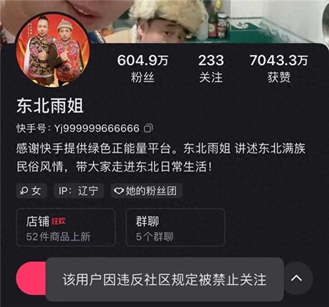 记者注意到,“东北雨姐”快手账号也已经被禁止关注,系统显示“该用户因违反社区规定被禁止关注”。