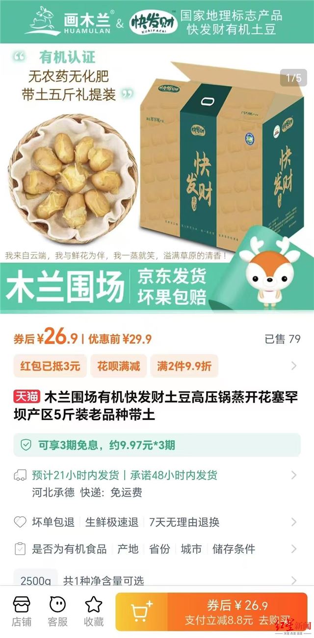 此外,红星新闻记者注意到,董宇辉此前在直播时推荐的“快发财”土豆目前依旧在鑫达商贸有限公司的相关网店上销售,但已没有“有机”字样,售价是5斤29.9元。