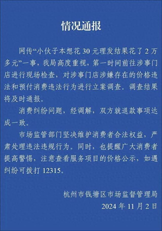 杭州市钱塘区市场监督管理局11月2日通报,网传“小伙子本想花30元理发结果花了2万多元”一事,该局高度重视,第一时间前往涉事门店进行现场检查,对涉事门店涉嫌存在的价格违法和预付消费违法行为进行立案调查。调查结果将及时通报