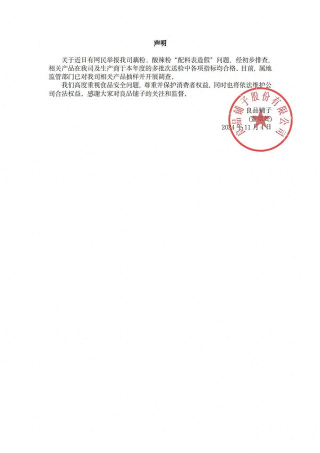 【良品铺子回应部分产品“配料表造假”:相关产品本年度多批次送检合格 监管部门已开展抽样调查】财联社11月4日电,近日,网红博主“松哥打虎”发布视频称,良品铺子部分产品涉嫌配料表造假,其中藕粉产品中检测出掺杂木薯淀粉,酸辣粉产品中,面饼配料表显示为红薯粉,但检测结果显示红薯、木薯、马铃薯均未检出。对此,良品铺子今日发布声明称,经初步排查,相关产品在公司及生产商于本年度的多批次送检中各项指标均合格。目前,属地监管部门已对公司相关产品抽样并开展调查。(财联社记者 吴蔚玲)