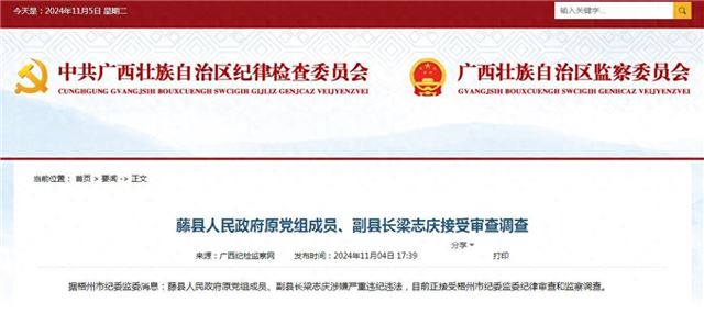 据梧州市纪委监委消息:藤县人民政府原党组成员、副县长梁志庆涉嫌严重违纪违法,目前正接受梧州市纪委监委纪律审查和监察调查。