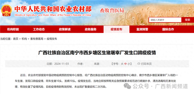 根据农业农村部消息,近日,农业农村部接到中国动物疫病预防控制中心报告,经广西壮族自治区动物疫病预防控制中心确诊,南宁市西乡塘区某屠宰厂入场的一车生猪,发现口蹄疫疫情,同车生猪10头,发病10头。