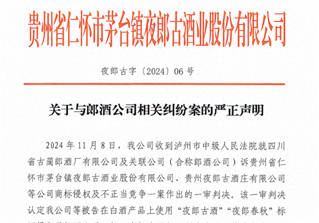 《关于与郎酒公司相关纠纷案的严正声明》显示,郎酒状告夜郎古酒业,称夜郎古酒业等公司字号“夜郎古”中带“郎”,故意攀附“郎”商标商誉;夜郎古酒业等公司在“夜郎古”注册商标之后加注商品通用名称“酒”构成不规范使用,对郎酒商标构成侵权。