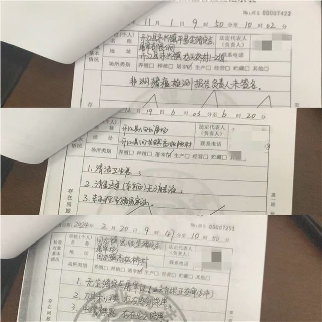此后,肖某的屠宰点又在去年11月、12月及今年2月,因“非洲猪瘟检测报告负责人未签名”“清洁卫生差”及“未办理《生猪定点屠宰证》”等问题,被开江县农业农村局三次下达责令整改通知。其间,对于未办理《生猪定点屠宰证》一事,肖某曾自述:“正在审办中。”