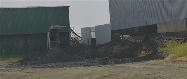 鑫友厂区内,我们还看到,机械设备正在忙碌,大量黑色的尾砂源源不断地顺着传送带被输送出来,随意堆放在地上,没有任何环保设施。