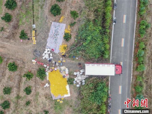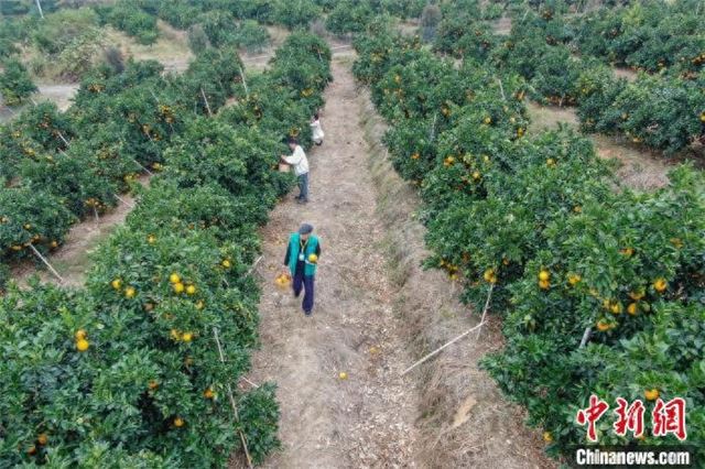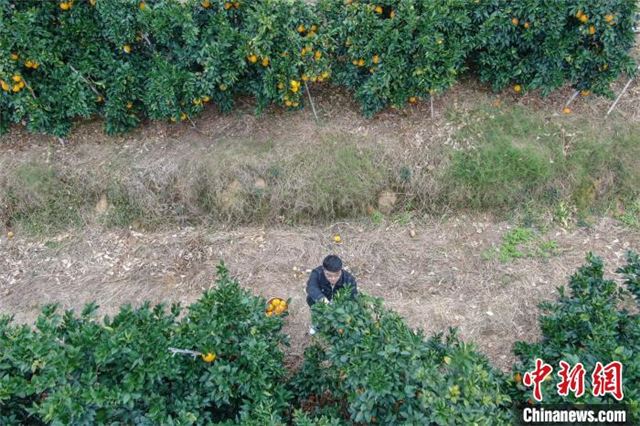 11月23日,江西赣州信丰县一果园,农户把采摘下来的赣南脐橙分拣装框准备运走。(无人机照片)中新社记者 刘力鑫 摄