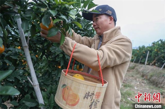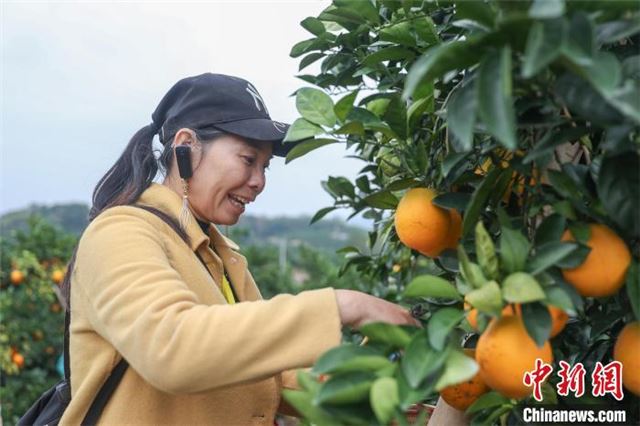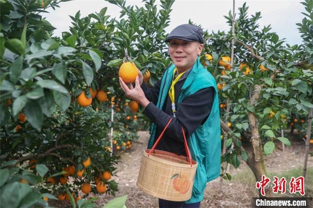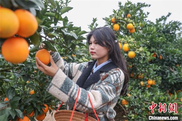 11月23日,江西赣州信丰县一果园,游客在采摘赣南脐橙。中新社记者 刘力鑫 摄