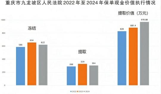从九龙坡区法院2022年至2024年保单现金价值执行的冻结数量、提取数量和提取金额等相关情况来看,总体数量呈现上升的轨迹,这反映出近年来随着生活水平提高,人民群众购买商业保险抵御风险的意识逐步增强。