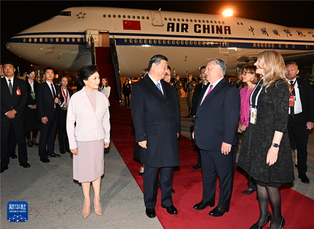 新华社布达佩斯5月9日电(记者张远 马峥)当地时间5月8日晚,国家主席习近平乘专机抵达布达佩斯,应匈牙利总统舒尤克和总理欧尔班邀请,对匈牙利进行国事访问。 当地时间5月8日晚,国家主席习近平乘专机抵达布达佩斯,应匈牙利总统舒尤克和总理欧尔班邀请,对匈牙利进行国事访问。匈牙利总理欧尔班夫妇、外长西雅尔多等政府高级官员在机场热情迎接习近平和夫人彭丽媛。新华社记者 谢环驰 摄 习近平乘坐的专机进入匈牙利领空后,匈牙利两架空军战机升空护航。 习近平乘坐的专机抵达布达佩斯国际机场时,匈牙利总理欧尔班夫妇、外长西雅尔多等政府高级官员热情迎接。两国领导人夫妇亲切握手致意,欧尔班总理向彭丽媛教授献花。礼兵在红毯两侧列队致敬。两名身着民族服装的匈牙利儿童向习近平主席夫妇献上面包和盐,用传统礼节欢迎最尊贵的客人。匈中双语学校的学生向习近平夫妇献花,并用中文说:“欢迎您来到匈牙利”。少年儿童跳起欢快的民族传统舞蹈查尔达什舞曲,向习近平表达最热烈的欢迎。 习近平发表书面讲话。习近平指出,很高兴应舒尤克总统和欧尔班总理的盛情邀请,对美丽的匈牙利进行国事访问。中匈两国是相互信赖的好朋友、好伙伴。近年来,双方高层交往密切,互信水平不断提高,共建“一带一路”合作成果丰硕,人文交流丰富多彩,在国际和地区事务中紧密协调和配合,为相互尊重、公平正义、合作共赢的新型国际关系树立起一个典范。今年是中匈建交75周年,两国关系发展迎来重要契机。我期待着同舒尤克总统、欧尔班总理等匈牙利领导人会晤,共同规划两国合作发展新蓝图,引领中匈关系向着更高水平迈进。我相信,无论国际风云如何变幻,中匈两国必将坚持以宽广视野、长远眼光看待和把握双边关系,踔厉奋发,勇毅前行,携手构建人类命运共同体,为促进世界和平稳定和发展繁荣作出应有贡献。相信在双方共同努力下,这次访问一定会取得圆满成功,推动中匈关系迎来更加美好的明天。 习近平主席夫人彭丽媛,中共中央政治局常委、中央办公厅主任蔡奇,中共中央政治局委员、外交部部长王毅等陪同人员同机抵达。 中国驻匈牙利大使龚韬也到机场迎接。 习近平乘车从机场赴下榻饭店途中,数百名当地华人华侨和中国留学生聚集在道路两旁,挥舞中匈两国国旗,举着“中匈友谊长青”、“热烈欢迎习近平主席访问匈牙利”等横幅,热烈欢迎习近平主席到访。
