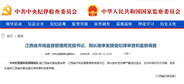 据江西省纪委监委消息:江西省市场监督管理局党组书记、局长谢来发涉嫌严重违纪违法,主动向组织交代问题,目前正接受江西省纪委监委纪律审查和监察调查。
