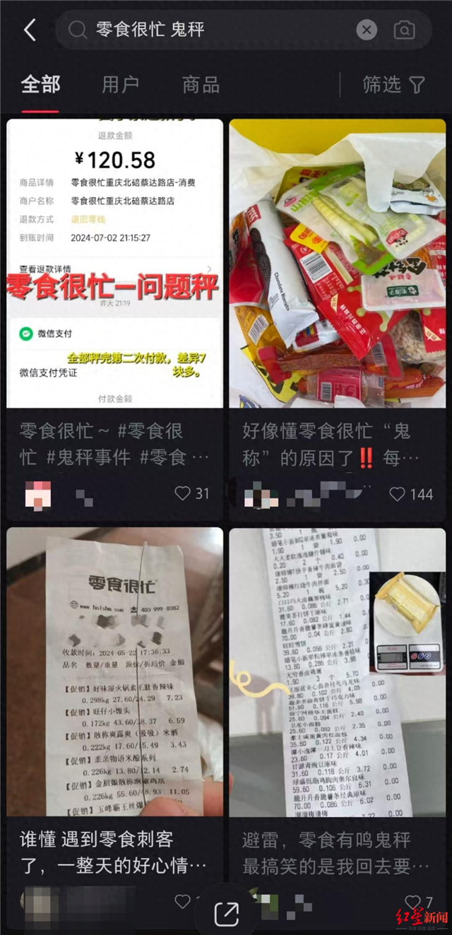 红星新闻记者注意到,在小红书、抖音等多个平台上,近期有不少网友称自己在“零食很忙”门店遇到“鬼秤”情况。有消费者称,结账时发现重量异常,要求工作人员重新称重,总价约100元的商品,两次结账价格相差7元多。