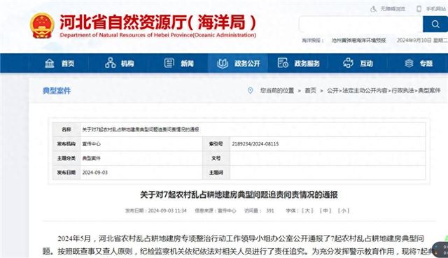 近日,河北省自然资源厅(海洋局)官网发布关于对7起农村乱占耕地建房典型问题追责问责情况的通报。全文如下: