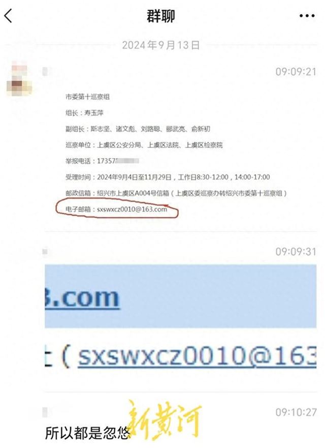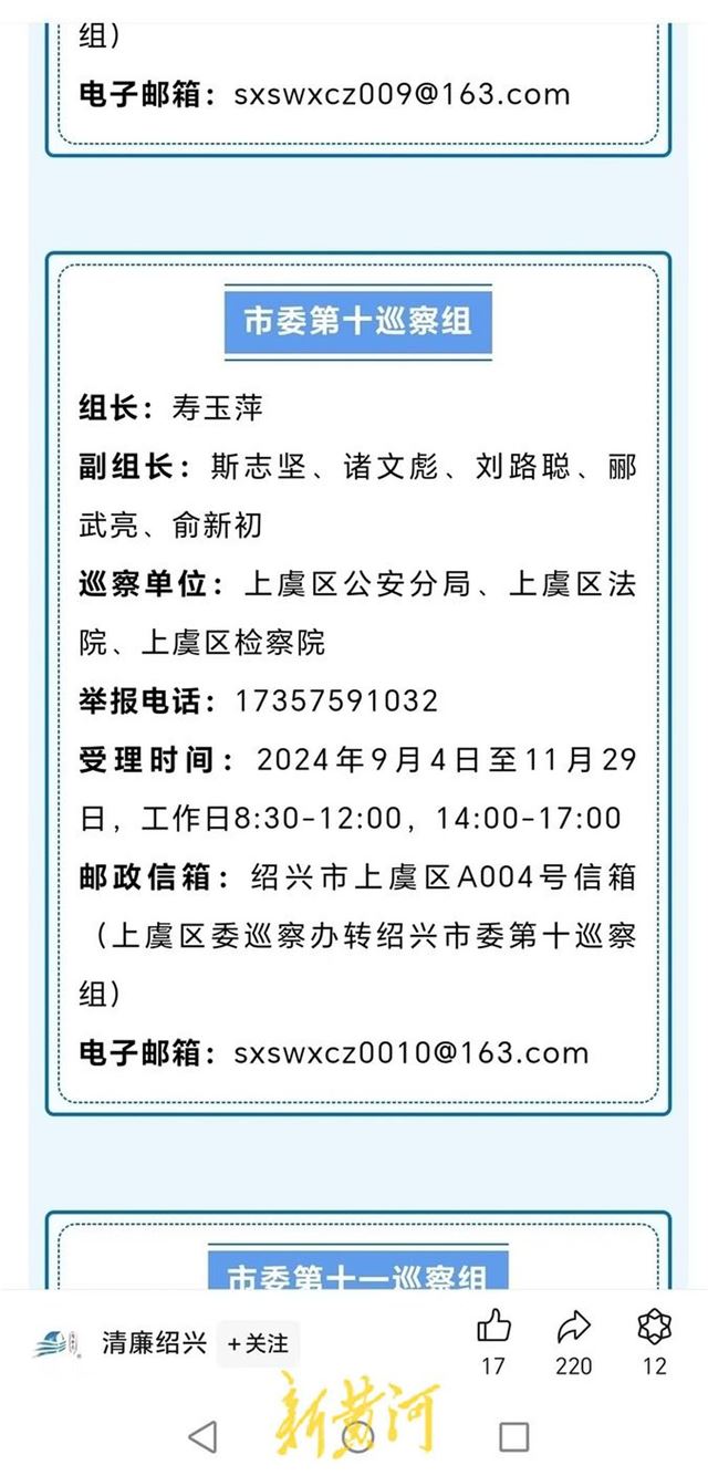 新黄河记者在绍兴市纪委监察委官方微信公众号上看到,9月10日发布的文章《九届市委第六轮巡察完成进驻并公布举报受理方式》称,截至9月9日,12个市委巡察组已全部完成进驻。巡察期间,市委巡察组设立专门的举报电话、邮政信箱和电子邮箱。第一巡察组电子邮箱为sxswxcz001@163.com,第二巡察组电子邮箱为sxswxcz002@163.com,第十巡察组电子邮箱为sxswxcz0010@163.com,第十一巡察组电子邮箱为sxswxcz0011@163.com,第十二巡察组电子邮箱为sxswxcz0012@163.com。