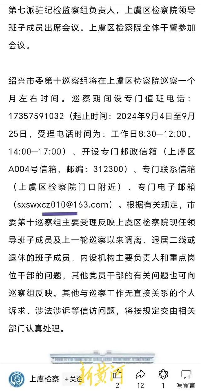 新黄河记者在上虞区人民检察院官方微信公众号上看到,9月5日有《绍兴市委第十巡察组巡察上虞区检察院党组工作动员会议召开》的相关文章。内容显示,绍兴市委第十巡察组将在上虞区检察院巡察一个月左右时间。巡察期间设专门值班电话、开设专门邮政信箱、专门联系信箱和专门电子邮箱,其中电子邮箱为sxswxcz010@163.com。