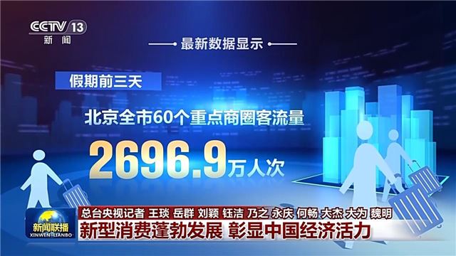 最新数据显示,假期前三天,北京全市60个重点商圈客流量2696.9万人次,同比增长20.9%;江苏全省重点商贸流通企业累计实现销售额约20.6亿元,同比增长13.5%;成都、杭州等地重点商圈人流量和销售额均呈现明显增长。