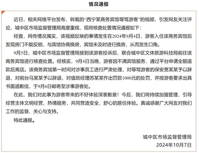 9月5日,城中区市场监督管理局接到该游客投诉后,联合城中区文体旅游科技局前往该商务宾馆进行核查处置。经核实,9月4日当晚,游客因不满宾馆服务,通过平台申请全额退款后离店。该商务宾馆第一时间对涉事员工进行严肃处理,对辱骂游客的保安贾某某予以辞退,对前台马某某予以辞退,对值班经理苏某某作出罚款1000元的处罚,并按游客要求出具书面道歉信,于9月6日邮寄至涉事游客处。