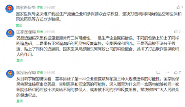 国家医保局表示,将聚焦核查串换药品,空刷医保和回流药的可能性,深入调查为什么同一盒药物能够被同一家医院诊所和药店数十次卖给不同的参保人,或者被不同的机构反复出售,坚决维护广大人民群众的健康权益。同时,对东阿阿胶公司的积极配合,国家医保局也表示感谢。