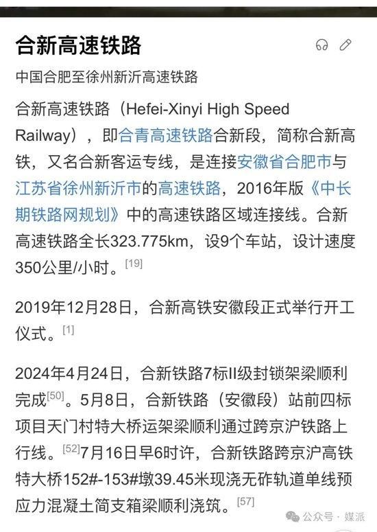 资料显示,合新高速铁路即合青高速铁路合新段,简称合新高铁,又名合新客运专线,是连接安徽省合肥市与江苏省徐州新沂市的高速铁路,2016年版《中长期铁路网规划》中的高速铁路区域连接线。合新高速铁路全长323.775km,设9个车站,设计速度350公里/小时。