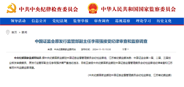 【中国证监会原发行监管部副主任李筱强接受纪律审查和监察调查】财联社11月15日电,据中央纪委国家监委驻中国证券监督管理委员会纪检监察组、江苏省纪委监委消息:中国证监会第一届、二届、三届创业板发审委委员、原发行监管部副主任李筱强涉嫌严重违纪违法,目前正接受中央纪委国家监委驻中国证券监督管理委员会纪检监察组纪律审查和江苏省苏州市监委监察调查。