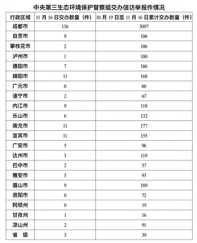 11月16日,中央第三生态环境保护督察组向四川移交第二十九批群众信访举报件235件(来电举报71件,来信举报164件),其中重点关注14件。