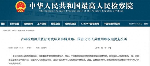 最高检11月25日消息,工业和信息化部原党组成员,国家烟草专卖局原党组书记、局长,中国烟草总公司原总经理凌成兴涉嫌受贿、国有公司人员滥用职权一案,由国家监察委员会调查终结,经最高人民检察院指定,由吉林省长春市人民检察院审查起诉。近日,吉林省长春市人民检察院已向吉林省长春市中级人民法院提起公诉。