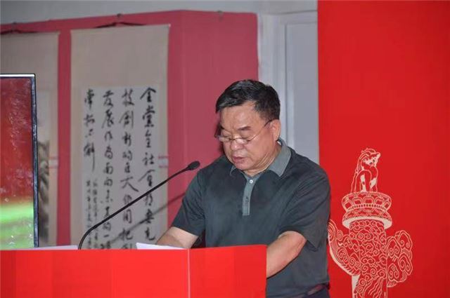 (中国行为法学会廉政书画院院长边保华介绍书画展情况)