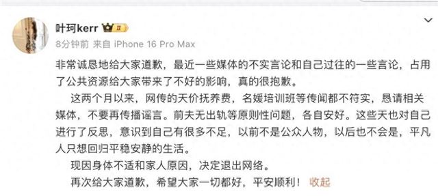 11月10日,叶珂本人微博 @叶珂kerr 发文,全文如下。